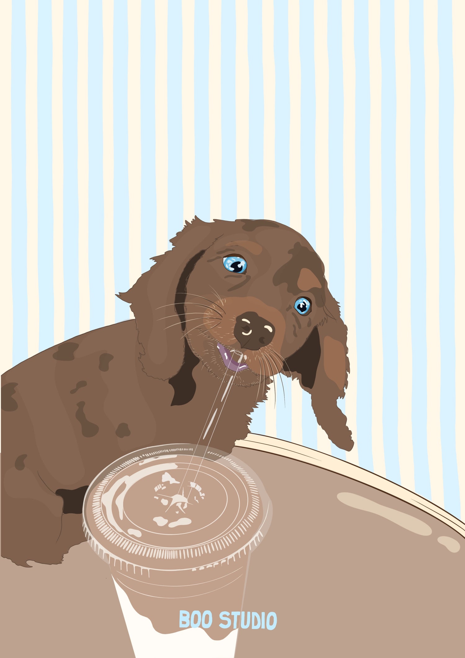 Douce et attachante, “Ice Latté” dépeint un chien brun aux yeux bleus savourant un café latté. Entre humour et tendresse, cette illustration capture un instant de quiétude quotidienne.