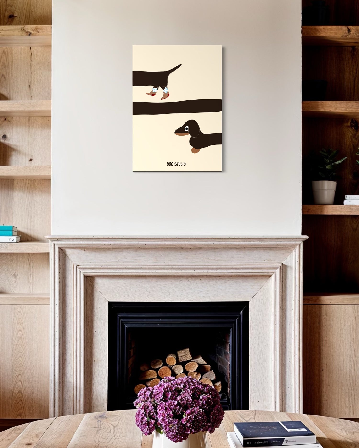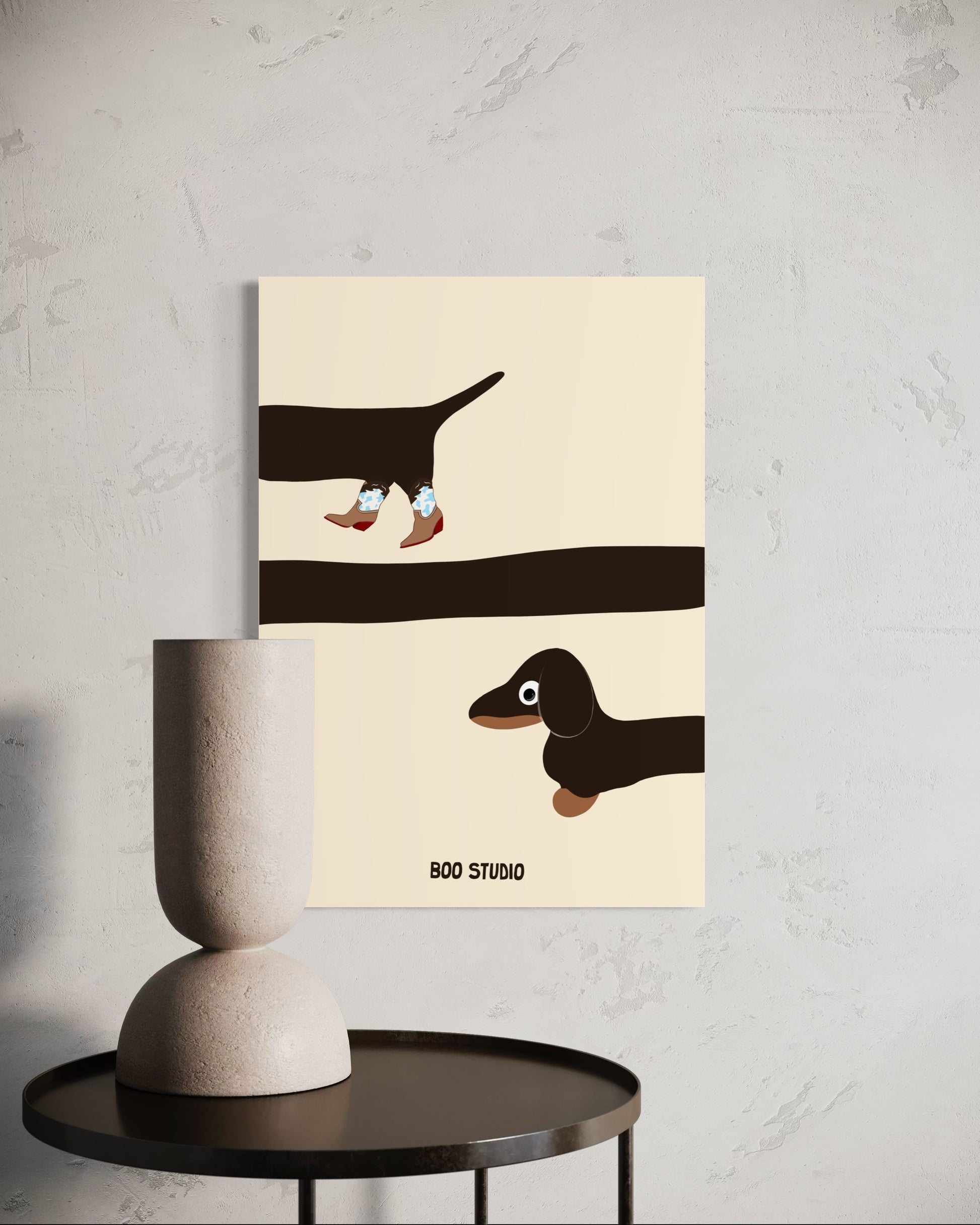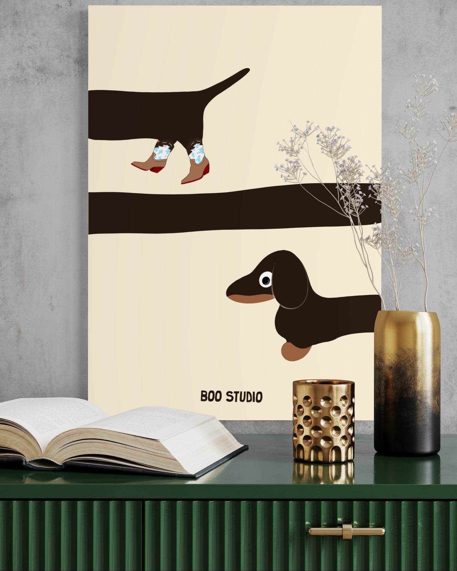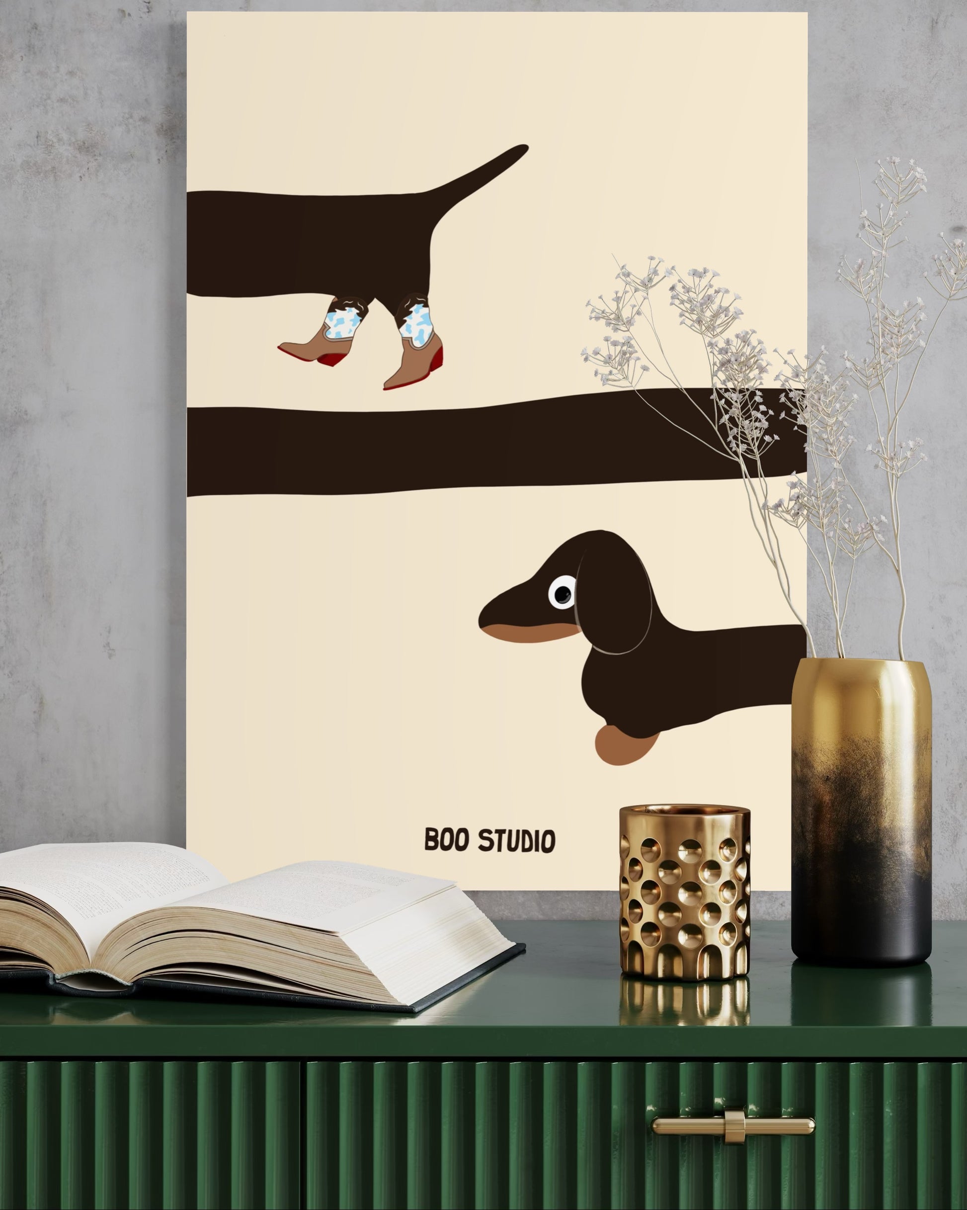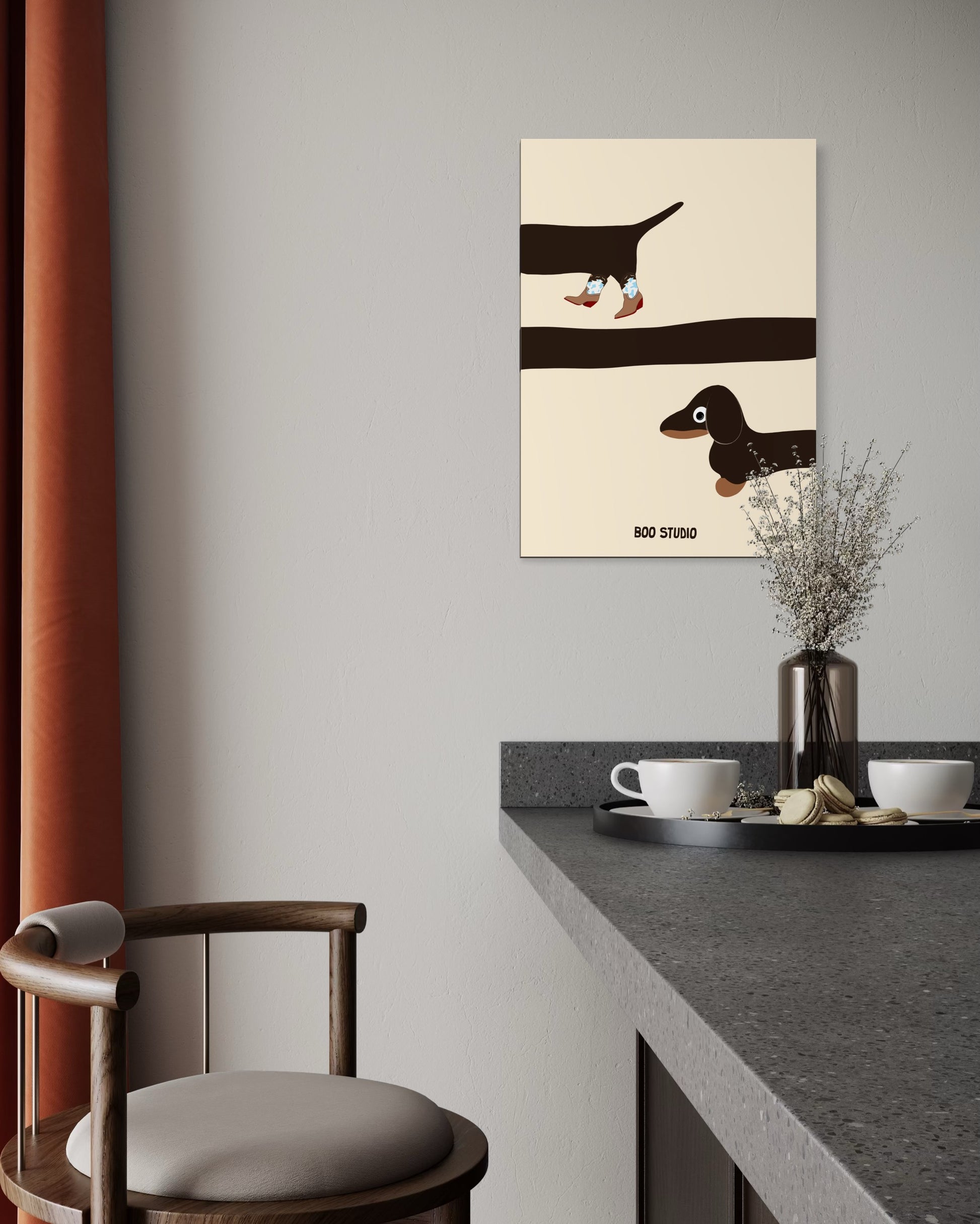 Idéale pour les amoureux des chiens et du design épuré, cette affiche est imprimée avec des couleurs Moka, beige et Bleu sur papier de qualité supérieure. Parfaite pour une chambre, un salon ou même un bureau, elle apporte une note joyeuse et contemporaine à vos murs.