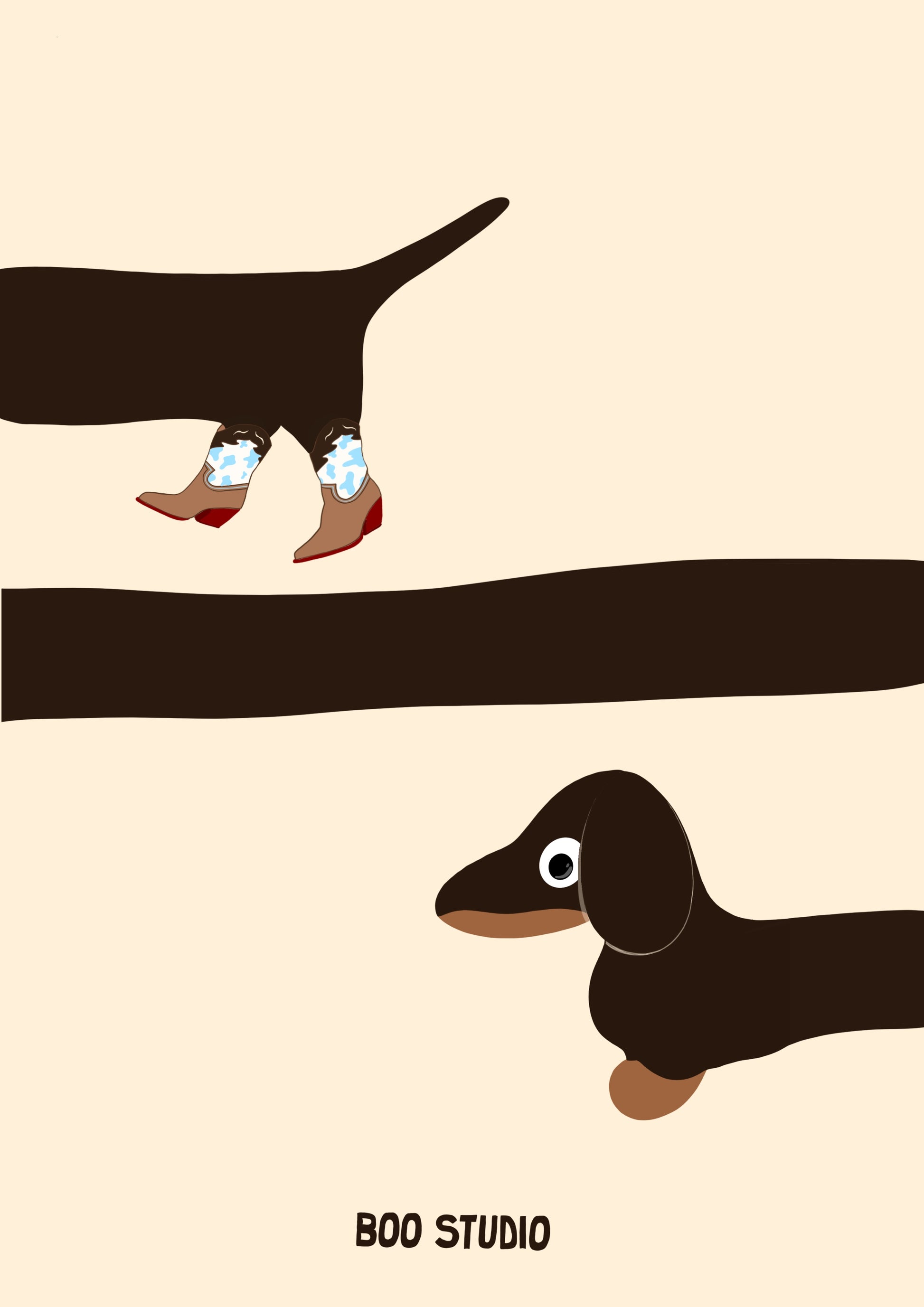 Sur un fond beige, un long teckel marron chaussé de botte se découpe en trois parties ludiques.