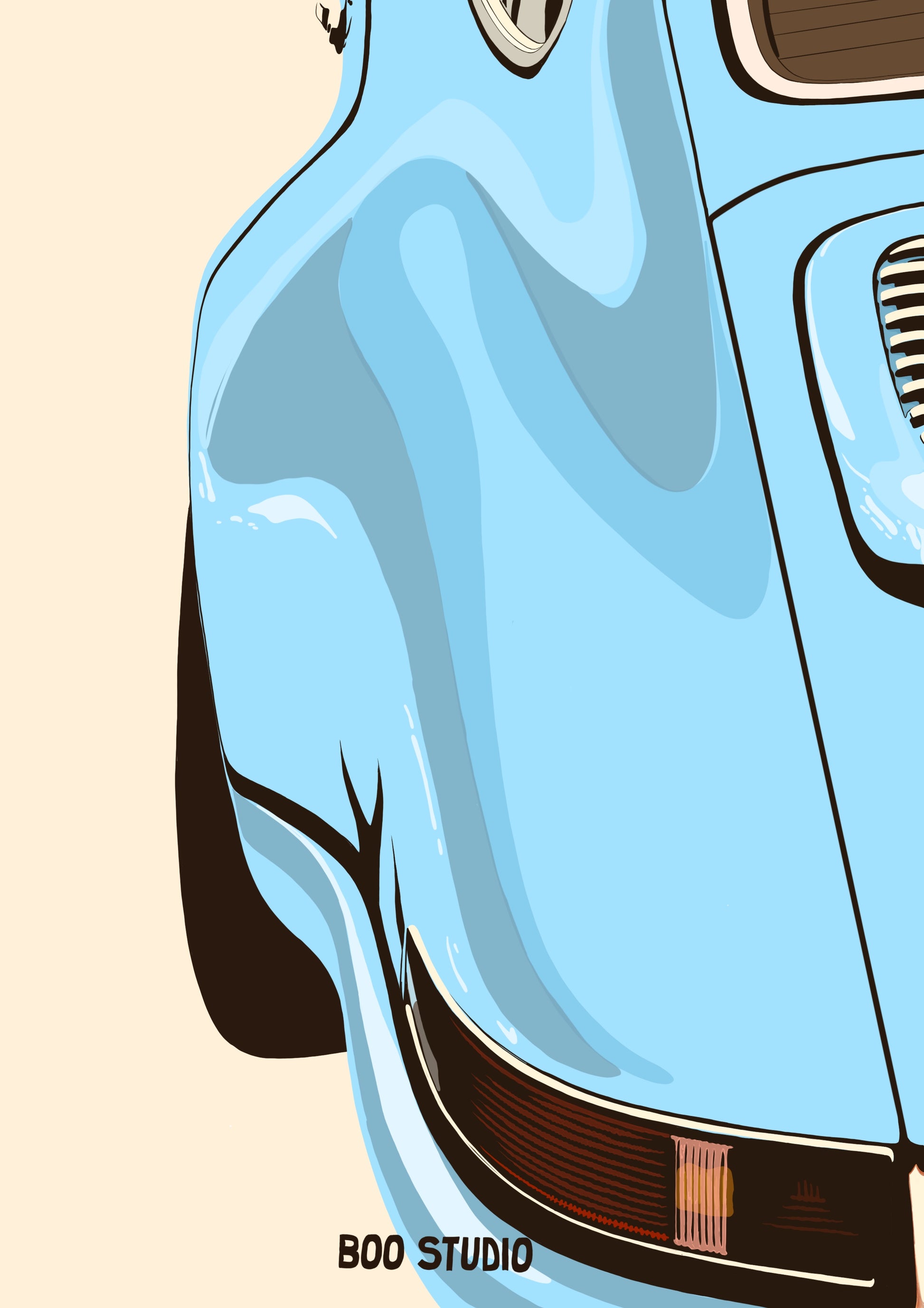 Sur un fond beige minimaliste, le zoom sur l’arrière gauche d’une Porsche 911 bleu pastel évoque l’élégance intemporelle et le design iconique.