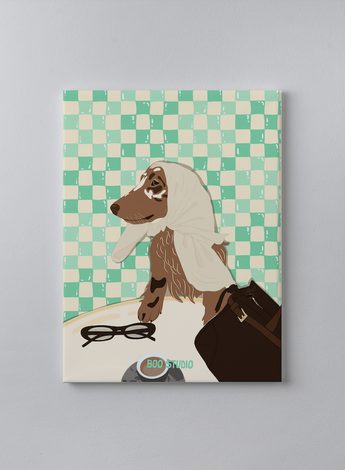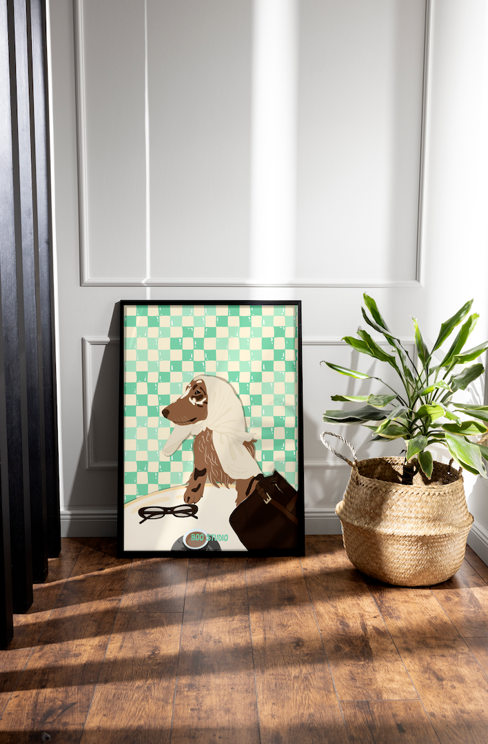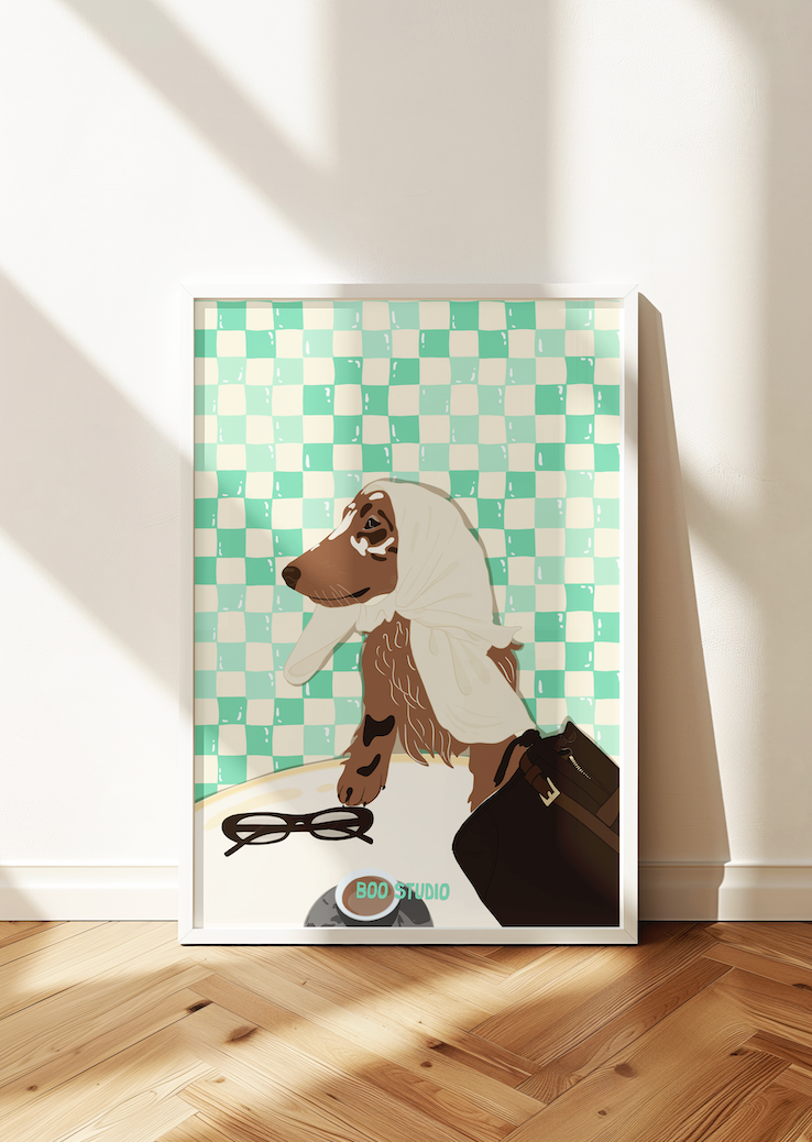 Ajoutez une touche parisienne et élégante à votre décoration avec l'affiche "Café Terrasse" , une illustration pleine de charme et de détails raffinés. Sur un fond beige à mini carreaux turquoise foncé et clair , un petit teckel au foulard beige se repose sur la table d'une terrasse, savourant un café. À ses côtés, une paire de lunettes tendance et un sac marron chic complètent la scène.