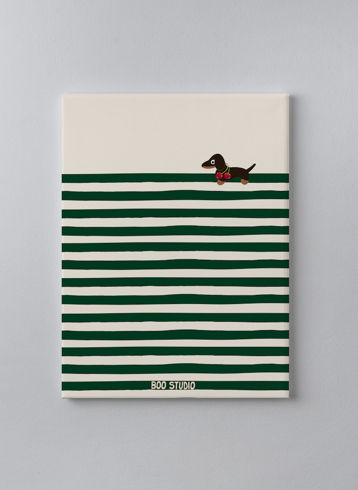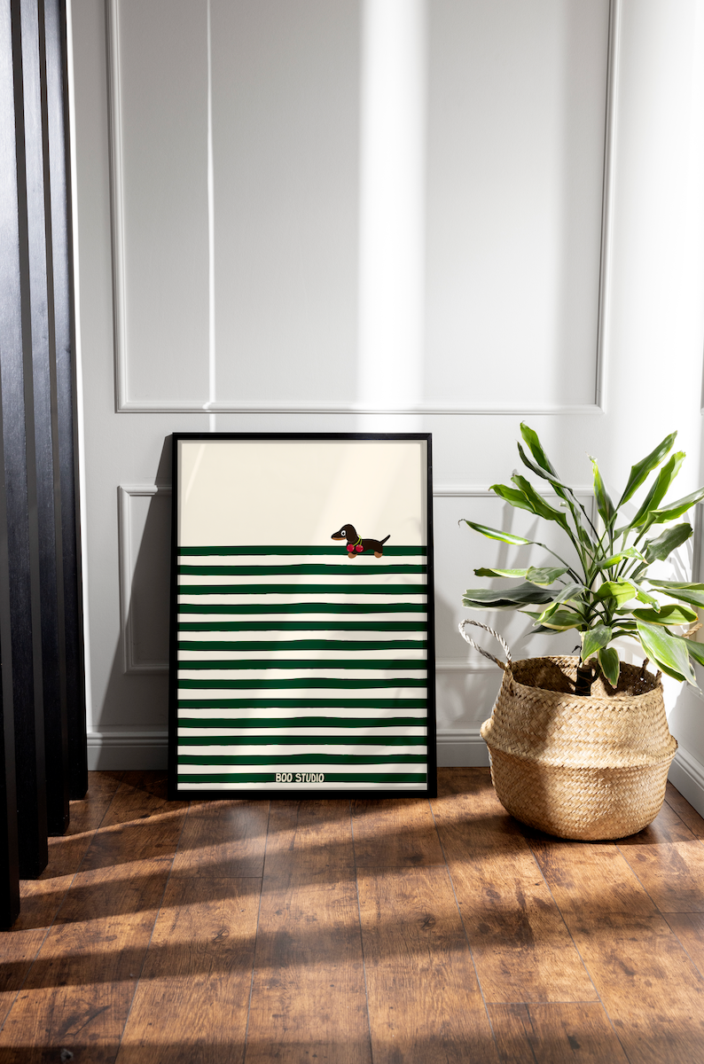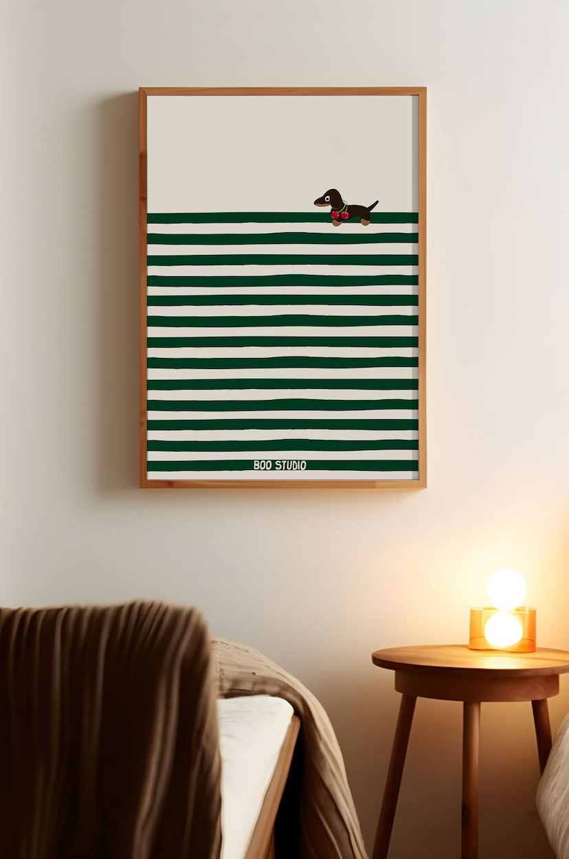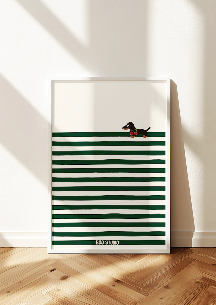 Apportez une touche ludique et chic à votre décoration avec l'affiche "Marinière" , une illustration originale au style graphique et tendance. Sur un fond beige élégant , des rayures vert sapin horizontales habillent les trois quarts de l'affiche, tandis qu'une cerise délicate et le célèbre petit teckel inspiré porte-clé viennent signer la composition dans l'angle supérieur droit.