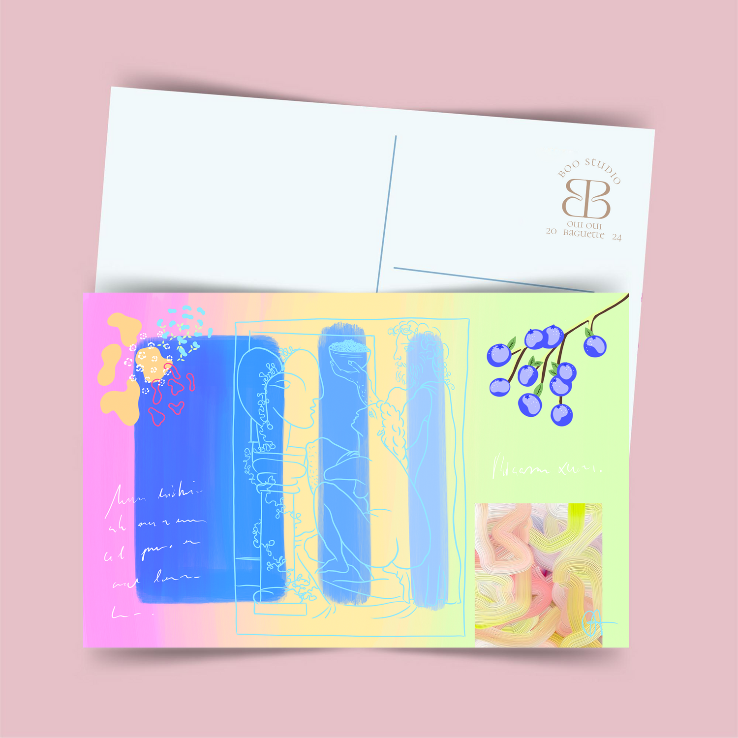 Trois couleurs se fondent comme une mémoire floue : vert d’eau, lilas, et sable.